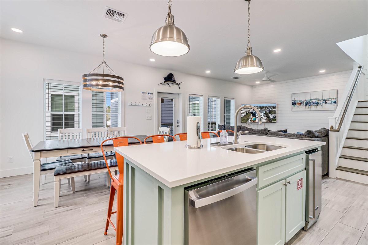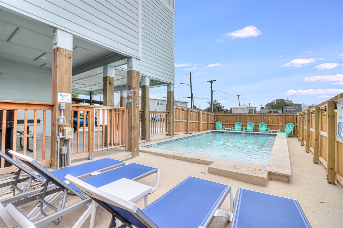 Easy beach access! Each house comes with fenced in private HEATED pool, a six seater gas golf cart, room for plenty of guests and grill! The beach is 3/4 mile away so you can pack gear and people on the golf cart and be there is less than 5 minutes! Shopping, restaurants, bars, and fishing are all less than a mile away! This is the perfect get away place. Spacious, well equipped kitchen with granite counters, lots of cabinets and storage open to living and dining area with high ceilings. Tile flooring throughout.