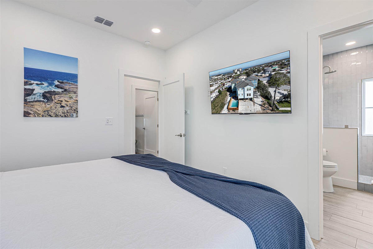 3 King bedrooms, each with ensuite baths and a bunkroom with twin beds for 6 and a full bath in the hallway, 2 additional half baths, and an outdoor shower. (See the last few pictures for the full floor plan)